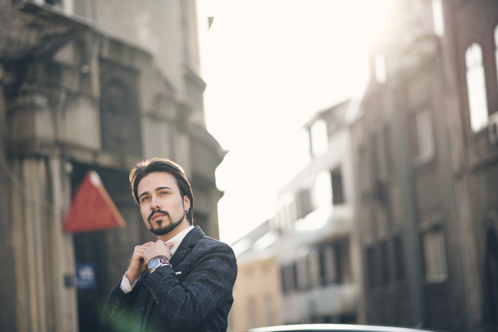Retro fashioned business man in a typical english suit, tweed coat and waist coat, bearded guy on a street posing